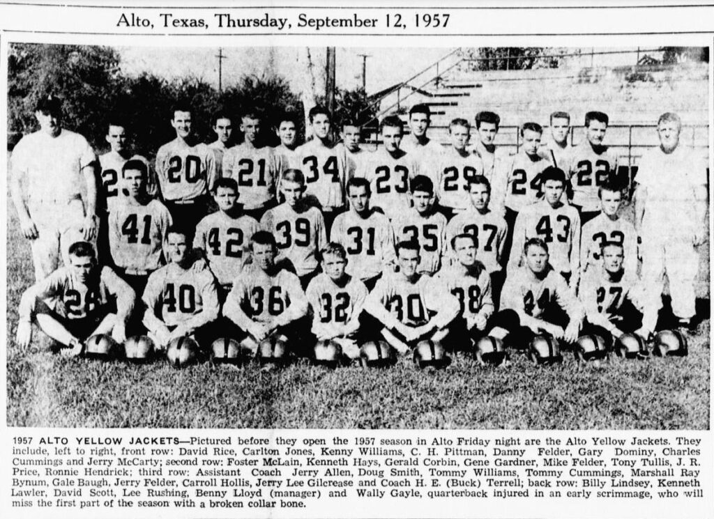Some of these names should be familiar, but you may not recognize the youthful faces: David Rice, Carlton Jones, Kenny Williams, C H Pittman, Danny Felder, Gary Dominy, Charles Price, Ronnie Hendrick, Doug Smith, Tommy Williams, Tommy Cummings, Marshall Ray Bynum, Gale Baugh, Jerry Felder, Carroll Hollis, Jerry Gilcrease, Billy Lindsey, Kenneth Lawler, David Scott, Lee Rushing and Benny Lloyd (Manager). Quarterback Wally Gayle was out for the first part of the season with a broken collarbone. Coaches were Buck Terrell and Jerry Allen. (Only 2!)